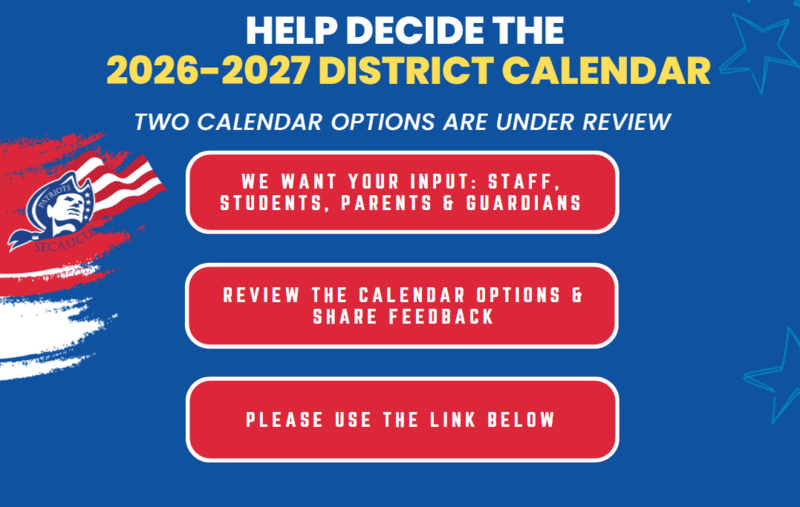 × Help Decide the 2026-2027 Secaucus District Calendar The Secaucus Board of Education is seeking community feedback regarding potential options for the 2026–2027 school calendar. Please take a moment to review the attached calendar options (posted below on our District Facebook Page) and share your feedback by completing the survey (link below). This brief survey should take approximately one minute to complete. Thank you for sharing your input. 2026-2027 District Calendar Survey Don't show again