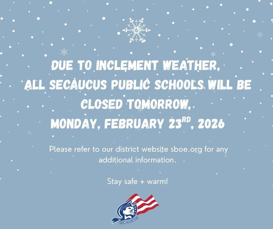 Please be advised that due to inclement weather, all Secaucus Public Schools will be closed tomorrow, Monday, February 23, 2026 Please be advised that due to inclement weather, all Secaucus Public Schools will be closed tomorrow, Monday, February 23, 2026